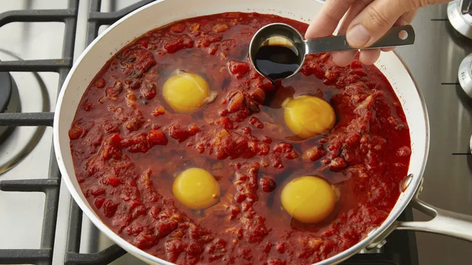 Step2With back of spoon, make 4 evenly-spaced indentions in tomato mixture. Gently crack an egg into each indention. Drizzle soy sauce over eggs. Cover; reduce heat to low.