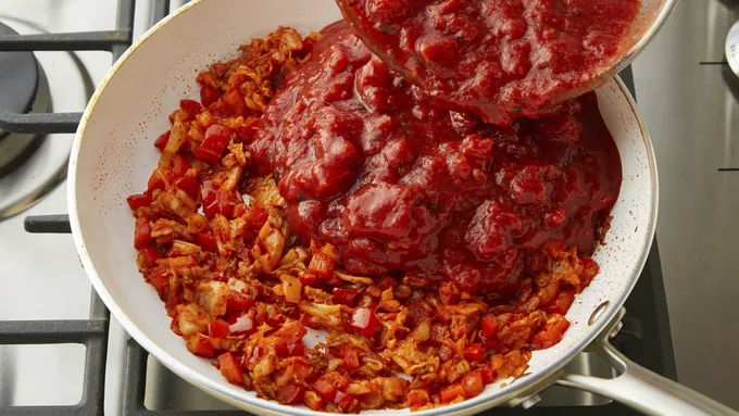 Step1In 10-inch skillet, melt butter over medium-high heat; add bell pepper and kimchi. Cook 6 to 8 minutes, stirring frequently, until peppers brown on edges. Reduce heat to medium; stir in tomatoes and sesame oil. Simmer 4 to 6 minutes or until thickened.