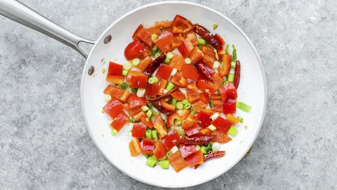 Step4Add white green onion and red peppers, cook for 1 minute more.
