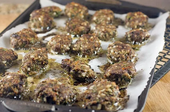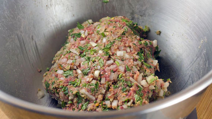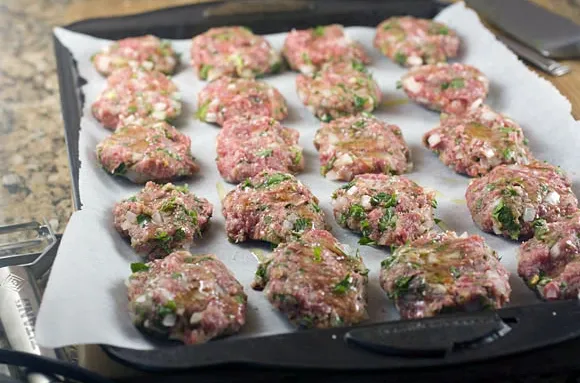 Step3Line a baking sheet with parchment paper for easier clean up and form large tablespoon-sized meatballs with lamb mixture. Flatten each ball slightly into a disc. You should get 20-24 balls out of the lamb mixture.