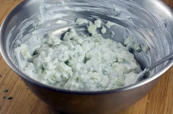 Step1For Tzatziki sauce, peel and seed cucumber and dice finely. Also mince garlic and parsley. Add to a bowl with yogurt and other ingredients and stir together. Store in fridge until needed. Can be made in advance.