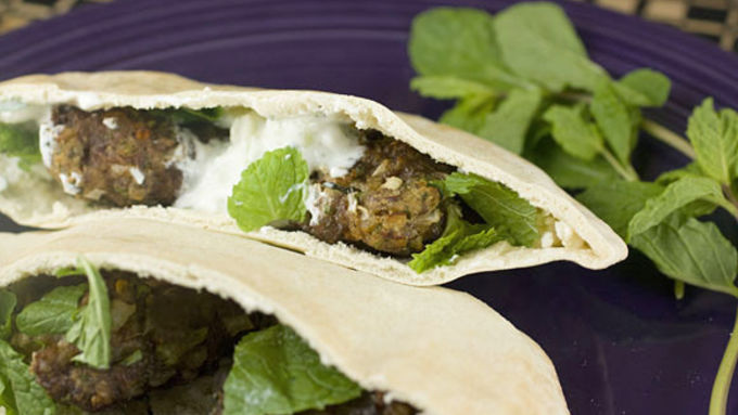 Step6Add a few spoonfuls of tzatziki sauce to the pita along with a pinch of crumbled feta. Add 2-3 lamb balls to each half of the pita and garnish with another drizzle of sauce and a few sprigs of fresh mint. Serve immediately!