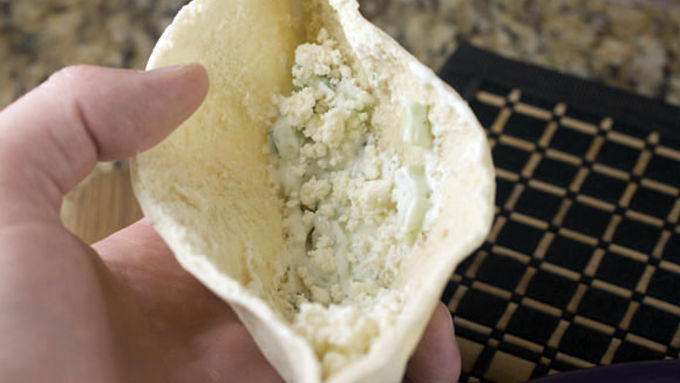 Step5To make a sandwich, separate pita bread so you can stuff it. Sometimes it helps to microwave the pita for 10 seconds.