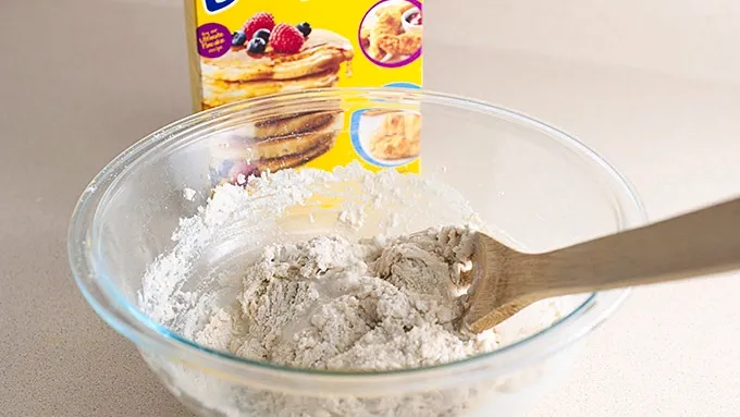 Step1Preheat the oven to 450°F. Add the Bisquick and milk to a medium bowl and stir with a wooden spoon.