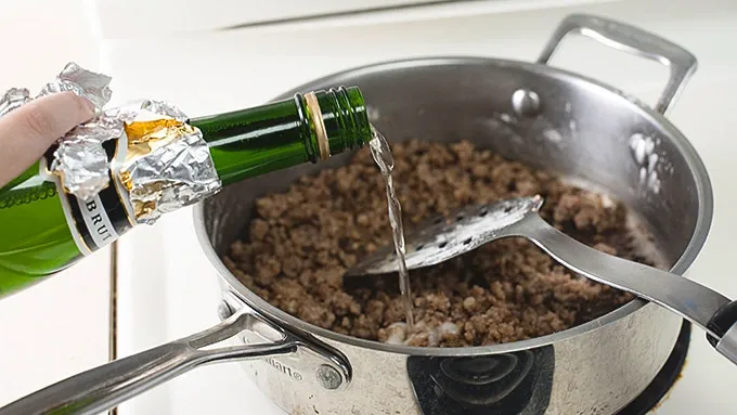 Step6Pour 1/4 cup of the champagne into the pan and scrape up the browned bits on the bottom of the pan.