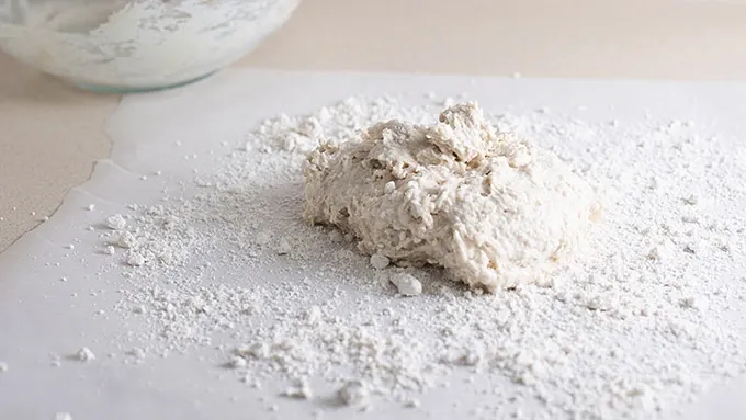 Step2Sprinkle a sheet of parchment paper with more Bisquick and turn the dough out on the surface. Knead 10 times, adding more Bisquick if needed to keep the dough from sticking to your hands.