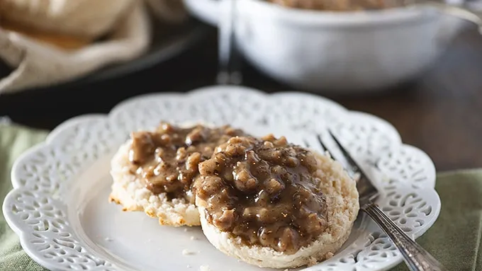 Step8Split the biscuits in half and top with the gravy. Serve immediately.