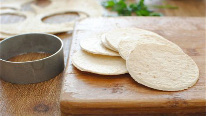 Step4For the crostini: Using a cookie cutter, cut circles out of the tortillas. Toast them up a little.