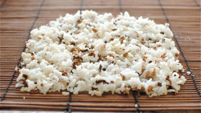 Step1For the sushi: Spread a layer of rice on top of a bamboo place mat.