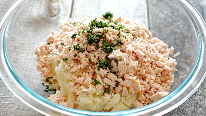 Step2In a large bowl, combine the mashed potatoes, chopped turkey, thyme, oregano, and a pinch of salt and pepper.