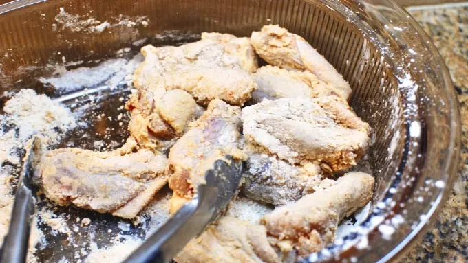 Step3Strain the wings. Toss the wings in the rice flour to lightly coat. Fry the wings at 350°F for 8 minutes, in 2 batches.