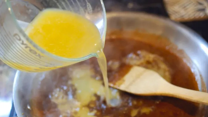 Step2Put the soy sauce and brown sugar into a pan and cook to melt the sugar and form a sticky glaze. Let this simmer for 2 minutes. Add in citrus juice and chili flakes. Whisk to bring it together and bring to a simmer. Simmer for about 10 minutes.