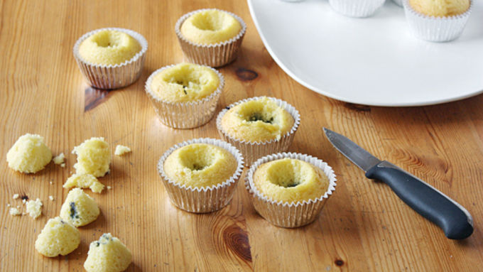 Step5Using a sharp paring knife, cut out a 1-inch wide by 1-inch deep hole in the top center of each fully cooled cupcake. Discard the centers.