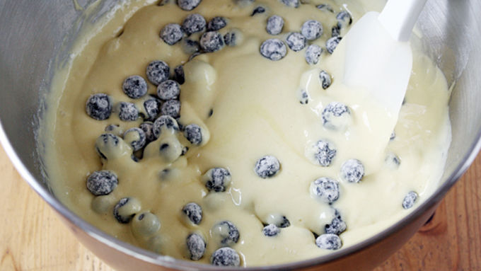 Step3Toss blueberries with flour and fold into batter. Divide batter among paper baking cups (each cup should be about 2/3 full).