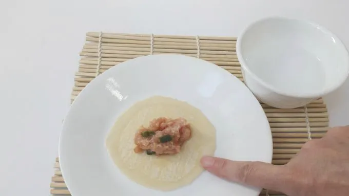 Step2Place a teaspoon of the lemon chicken filling in the middle of a gyoza wrapper. Moisten the edges of the wrapper with water. Fold wrapper in half and press together the edges, making small pleats if desired to seal the potsticker. Repeat until all wrappers are filled.