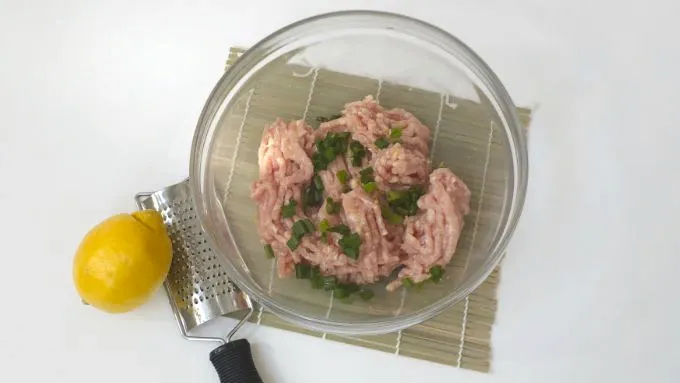Step1Place ground chicken in a large bowl. Add the lemon juice, lemon peel, green onions and garlic. Add the soy sauce and sesame oil. Mix everything together to thoroughly combine.