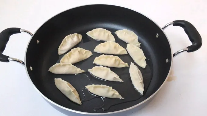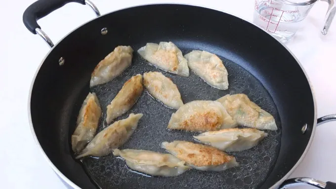 Step3Heat oil in a large non-stick pan over medium-high heat and place about 12 potstickers in the pan. Fry for about 2 minutes until golden brown.