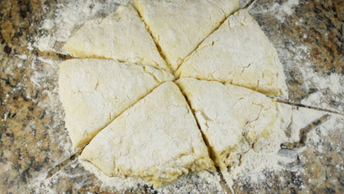 Step5Scoop scone dough out onto a lightly floured surface and form it into a circle. The dough should be about 3/4 inch high. Lightly flour the top of the scone dough also to make it easier to work with.