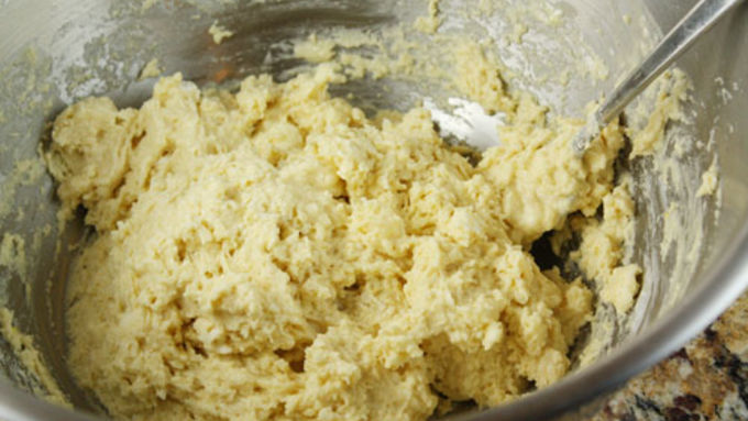 Step1Combine dry ingredients (flour, salt, baking powder) in a medium bowl and mix well. Then cut in the cold butter using either a fork or your clean fingers. Mix the butter into the flour until it's in little balls.