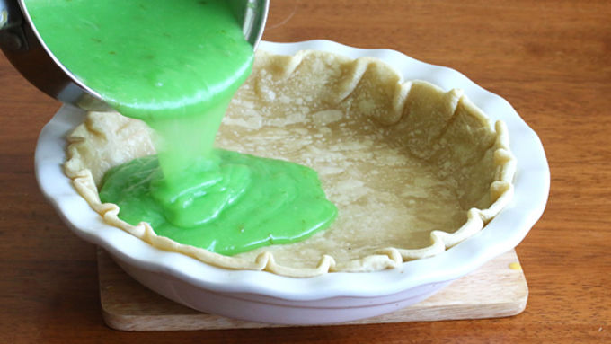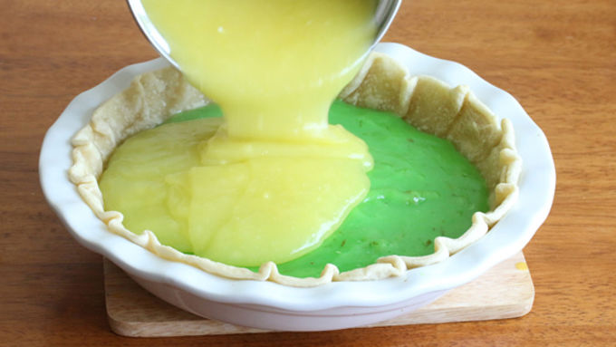 Step4Whisk 1/4 cup of the hot mixture into one of the egg yolk bowls until combined. Then whisk this egg yolk mixture back into the saucepan with the rest of the hot mixture. Add a few drops of natural green food coloring. Return the mixture to a simmer until thickened, then whisk in the butter. Pour the lime layer into the bottom of the pre-baked pie crust.