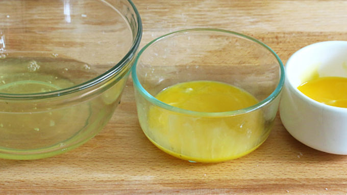 Step2Get the eggs ready in advance. Set out 3 bowls, one large and two small. Crack the egg whites into the big bowl and divide the yolks between the two small bowls, three yolks in each.
