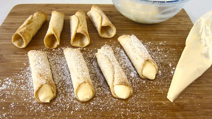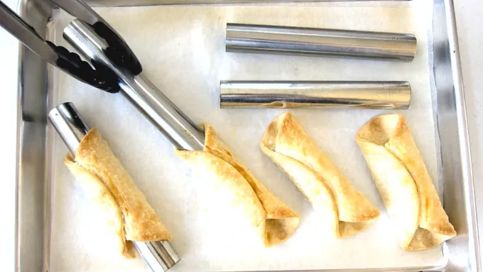 Step3Remove and bake for 10-12 minutes until lightly golden brown. Allow to cool for 10 minutes then carefully remove them from the cannoli forms. Let them cool completely.