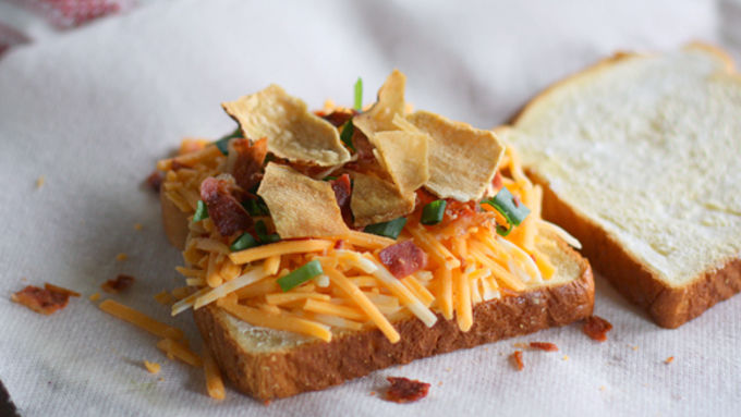 Step2Butter the outside of both sides of the bread. Turn bread over and lather the inside of the bread with the sour cream. On one piece of the sour cream-lathered bread, pile on your cheese, bacon, green onions, and potato chips.