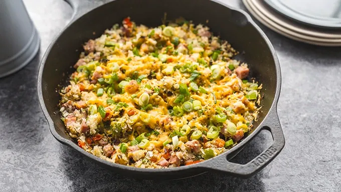 var configuration = {"title":"Loaded Cauliflower Hash Browns","introduction":"You’ve already tried cauliflower as rice, pizza crust and Buffalo wings. And now, a new twist on the white veggie you never knew you loved—lower-carb, potato-less hash browns. We promise, your breakfast is begging for this dish. Big time.","servingSize":"1 Serving","image":{"small":{"media":"(min-width: 0px)","src":"https://mojo.generalmills.com/api/public/content/WRDa1lhVe069QAinLEhSYA_webp_base.webp?v=a380d2c1\u0026t=e724eca7b3c24a8aaa6e089ed9e611fd"},"medium":{"media":"(min-width: 500px)","src":"https://rms-media-prod.generalmills.com/39bacbbf-dbc0-4f6d-8b22-bd2ccb041fa4.jpg"},"large":{"media":"(min-width: 767px)","src":"https://rms-media-prod.generalmills.com/39bacbbf-dbc0-4f6d-8b22-bd2ccb041fa4.jpg"},"alt":"Loaded Cauliflower Hash Browns"},"contributor":{"label":"by:","name":"Cheeky Kitchen","profileUrl":"/contributors/cheeky-kitchen","displayDate":{"label":"Updated","date":"Dec 16, 2016"}},"ingredientGroups":[{"ingredients":[{"quantity":"1","description":"large head of cauliflower, stem removed"},{"quantity":"","description":"1-2 tablespoons coconut oil, melted"},{"quantity":"1/2","description":"red pepper, seeded and diced"},{"quantity":"1/2","description":"green pepper, seeded and diced"},{"quantity":"1","description":"cup diced ham"},{"quantity":"1/2","description":"cup shredded sharp cheddar"},{"quantity":"1/4","description":"cup diced green onions"},{"quantity":"","description":"Salt and pepper, to taste"}]}],"steps":[{"description":"With a cheese grater, grate cauliflower until florets are totally shredded.","stepShotImageUrl":"//mojo.generalmills.com/api/public/content/wnRQHZ-s1k2hyKm6wVLCww_webp_base.webp?v=1ab87adc\u0026t=3653fe2f5ecd4a47a5a51c97e429947c"},{"description":"In a large nonstick skillet, melt 1 tablespoon of coconut oil over high heat. (If using cast iron or another nonstick pan, increase to 2 tablespoons.) Add cauliflower hash, green pepper and ham to pan. "},{"description":"Cook for 5-7 minutes, until the bottom layer begins to turn golden brown, then flip with a spatula, cooking 3-5 minutes more before flipping again. Continue to cook until cauliflower is medium golden brown."},{"description":"Top with cheddar and green onions. Salt and pepper to taste. Remove from heat and allow cheese to melt slightly before serving.","stepShotImageUrl":"//mojo.generalmills.com/api/public/content/085Ix4ycdUyP6nBVc-tVqA_webp_base.webp?v=35fd5d93\u0026t=3653fe2f5ecd4a47a5a51c97e429947c"}],"tips":[{"title":"","description":"Customize with your favorite hash brown add-ins, including: cooked ground sausage, crumbled cooked bacon, mushrooms, garlic or sweet onions.","category":"Variation","tipShots":[]},{"title":"","description":"Whether you’re using cauliflower or potatoes, the key to golden-brown hash browns is not to stir or flip them too often. Let everything sit unbothered in a hot skillet for several minutes to ensure the hash browns get…well…browned.","category":"Techniques","tipShots":[]},{"title":"","description":"Several years ago, I went paleo. Which, for me, ended up actually meaning “paleo-ish” because it’s really hard to stick to one specific diet when you taste-test and develop recipes for a living.\r\n\r\nAnd in this blogger’s paleo-ish opinion, I think the single best thing to come out of that diet movement is the existence of cauliflower mashed potatoes and cauliflower rice. Before this paleo stuff took over the internet, I never, never, never, never would choose to eat cauliflower. It just was not my veggie in any way. \r\n\r\nBut whip it up into a batch of mashed “potatoes” or chop it to make cauliflower “rice” and suddenly, I can’t get enough of the stuff. My veggie intake has tripled, simply because cauliflower has now become my go-to for so many dishes. So imagine my joy when I discovered that you could also grate the stuff and make a killer cauliflower version of hash browns. (Hello, breakfast. I love you.) \r\n\r\nIf you’d never tried a cauliflower-swap recipe, you’ve gotta give this one a try. You’ll never know you’ve swapped a single thing. Because, I KID YOU NOT, they taste JUST like regular hash browns.\r\n\r\nAdmittedly, the prepping part of this gave me a little anxiety. Cutting into cauliflower leaves a huge mess of crumbles everywhere. So, grating it seemed like the way to go here. And to keep the mess minimal, try this: place a large shallow bowl (or a 9x13-inch baking dish) in the bottom of a clean sink, and grate the cauliflower in there. Takes just minutes, and cleanup is so simple. \r\n\r\nOnce you’ve got the whole head of cauliflower grated, cook it up just as you would potato hash browns. And just like with potatoes, the key here not to stir or flip them too often. Let everything sit unbothered in a hot skillet for several minutes, to ensure the hash browns get…well…browned. Between the peppers and ham in the hash browns and the cheese and green onions on top, you’ll have yourself a skillet scramble so good, you’ll go potatoes over it.\r\n\r\nExcept, in this case, you","category":"No Title","tipShots":[]}],"kitchenTips":[{"title":"","description":"Customize with your favorite hash brown add-ins, including: cooked ground sausage, crumbled cooked bacon, mushrooms, garlic or sweet onions.","category":"Variation","tipShots":[]},{"title":"","description":"Whether you’re using cauliflower or potatoes, the key to golden-brown hash browns is not to stir or flip them too often. Let everything sit unbothered in a hot skillet for several minutes to ensure the hash browns get…well…browned.","category":"Techniques","tipShots":[]},{"title":"","description":"Several years ago, I went paleo. Which, for me, ended up actually meaning “paleo-ish” because it’s really hard to stick to one specific diet when you taste-test and develop recipes for a living.\r\n\r\nAnd in this blogger’s paleo-ish opinion, I think the single be