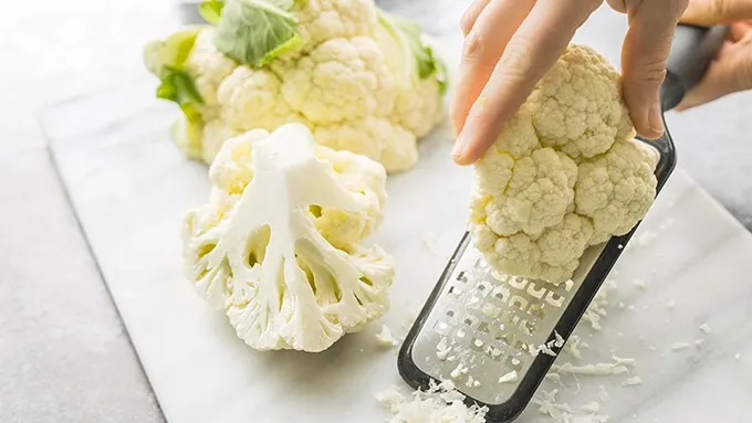 With a cheese grater, grate cauliflower until florets are totally shredded.