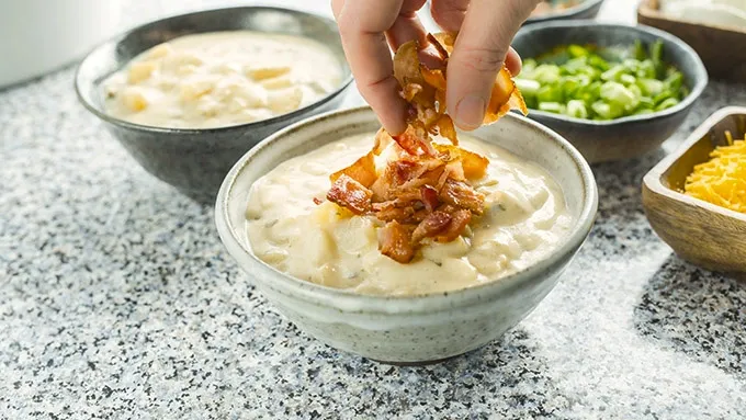 var configuration = {"title":"Loaded Slow-Cooker Potato Soup","introduction":"Classic, creamy potato soup, made in the slow cooker with just five ingredients and 15 minutes of prep time. When it’s time to eat, load it up with classic baked potato toppings like bacon, green onions and cheese. It’s comfort food by the spoonful.","servingSize":"1 Serving","image":{"small":{"media":"(min-width: 0px)","src":"https://mojo.generalmills.com/api/public/content/q6KDjM2ggU-jrDt3zf5BHQ_webp_base.webp?v=83fe1de4\u0026t=e724eca7b3c24a8aaa6e089ed9e611fd"},"medium":{"media":"(min-width: 500px)","src":"https://rms-media-prod.generalmills.com/68994df0-3dc6-48ca-8249-50c4b8bc77c5.jpg"},"large":{"media":"(min-width: 767px)","src":"https://rms-media-prod.generalmills.com/68994df0-3dc6-48ca-8249-50c4b8bc77c5.jpg"},"alt":"Loaded Slow-Cooker Potato Soup"},"contributor":{"label":"by:","name":"Cheeky Kitchen","profileUrl":"/contributors/cheeky-kitchen","displayDate":{"label":"Updated","date":"Nov 20, 2017"}},"ingredientGroups":[{"ingredients":[{"quantity":"","description":"4-6 large yellow potatoes, diced"},{"quantity":"1/2","description":"large onion, finely diced"},{"quantity":"2","description":"cloves garlic, chopped"},{"quantity":"2","description":"cans (18 oz each) Progresso™ Soup Creamy Mushroom"},{"quantity":"2","description":"cups Progresso™ chicken broth"},{"quantity":"","description":"Salt and pepper"}]},{"name":"Toppings (optional)","ingredients":[{"quantity":"1/2","description":"cup sour cream"},{"quantity":"1/2","description":"cup cooked bacon, crumbled"},{"quantity":"1/2","description":"cup shredded sharp cheddar"},{"quantity":"1/2","description":"cup diced green onions"}]}],"steps":[{"description":"Place potatoes, onion, garlic, soup and chicken broth in a 4- to 5-qt slow cooker.","stepShotImageUrl":"//mojo.generalmills.com/api/public/content/uacmXZ5WE06NQv16uHtRnw_webp_base.webp?v=c7016f15\u0026t=3653fe2f5ecd4a47a5a51c97e429947c"},{"description":"Cover and cook for 4-6 hours on high or 6-8 hours on low. Stir well; salt and pepper to taste.","stepShotImageUrl":"//mojo.generalmills.com/api/public/content/Euu_gqx4XU6KW1Efjj67Pw_webp_base.webp?v=e9184281\u0026t=3653fe2f5ecd4a47a5a51c97e429947c"},{"description":"Serve topped with sour cream, bacon, green onions and cheese.","stepShotImageUrl":"//mojo.generalmills.com/api/public/content/u2ELcEA55kSKNQAwnKtovw_webp_base.webp?v=4d039ebb\u0026t=3653fe2f5ecd4a47a5a51c97e429947c"}],"tips":[{"title":"","description":"For a twist on this recipe, use Progresso™ Potato \u0026 Bacon Soup instead of Creamy Mushroom.","category":"Variation","tipShots":[]},{"title":"","description":"There’s nothing better than a baked potato topped with all the fixings. Unless, of course, we’re talking about baked potato soup loaded with everything under the sun—bacon, cheddar, sour cream, green onions, etc.\r\n \r\nThis recipe is a classic—only it’s made even easier than the classic version, because this basic (but not #basic) soup calls for just 5 ingredients. Rather than making a rich roux with flour or cornstarch and butter, we shortened the prep time by tossing in creamy Progresso™ Soup. Set it, forget it and 6-8 hours later, you have a thick, creamy potato soup ready to be loaded up with all your favorite baked potato toppings. \r\n\r\nSo grab your Snuggie, cozy up in front of a crackling fire (place video on YouTube), and get through winter the delicious/baked potato soup way: one comforting spoonful at a time. \r\n","category":"No Title","tipShots":[]},{"title":"More About This Recipe:","description":"If you’ve had one potato soup, you haven’t had them all. There really is a \u003ca href=\u0022https://www.tablespoon.com/dishes/soup/potato-soup\u0022 target=\u0022_blank\u0022\u003epotato soup\u003c/a\u003e for everyone. The best part about slow cooker potato soup? While the base of the soup is cooking, you can get creative with toppings, ensuring every bowl is extra personal.","category":"Editorial","tipShots":[]}],"kitchenTips":[{"title":"","description":"For a twist on this recipe, use Progresso™ Potato \u0026 Bacon Soup instead of Creamy Mushroom.","category":"Variation","tipShots":[]},{"title":"","description":"There’s nothing better than a baked potato topped with all the fixings. Unless, of course, we’re talking about baked potato soup loaded with everything under the sun—bacon, cheddar, sour cream, green onions, etc.\r\n \r\nThis recipe is a classic—only it’s made even easier than the classic version, because this basic (but not #basic) soup calls for just 5 ingredients. Rather than making a rich roux with flour or cornstarch and butter, we shortened the prep time by tossing in creamy Progresso™ Soup. Set it, forget it and 6-8 hours later, you have a thick, creamy potato soup ready to be loaded up with all your favorite baked potato toppings. \r\n\r\nSo grab your Snuggie, cozy up in front of a crackling fire (place video on YouTube), and get through winter the delicious/baked potato soup way: one comforting spoonful at a time. \r\n","category":"No Title","tipShots":[]}],"additionalContent":[],"faq":[],"tipCategories":[{"categoryName":"Editorial","heading":"More About This Recipe","cssClass":"recipePartStory","expandOnInit":false,"expandText":"More +","collapseText":"Less -","expandEventName":"","collapseEventName":"","image":"","tips":[{"title":"More About This Recipe:","description":"If you’ve had one potato soup, you haven’t had them all. There really is a \u003ca href=\u0022https://www.tablespoon.com/dishes/soup/potato-soup\u0022 target=\u0022_blank\u0022\u003epotato soup\u003c/a\u003e for everyone. The best part about slow cooker potato soup? While the base of the soup is cooking, you can get creative with toppings, ensuring every bowl is extra personal.","category":"Editorial","tipShots":[]}],"isExpandable":false}],"nutritionInfo":{"configuration":{"showAsTable":false,"noNutritionInformationAvailableMessage":"No nutritio