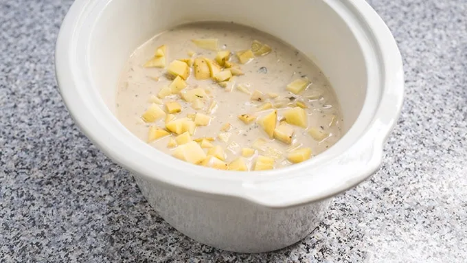 Place potatoes, onion, garlic, soup and chicken broth in a 4- to 5-qt slow cooker.