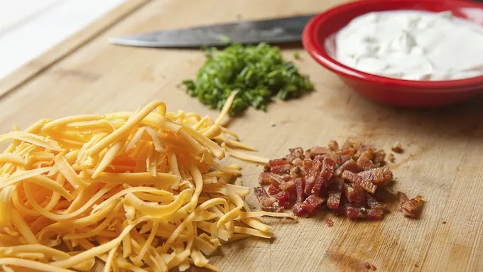 Step5Remove potatoes from oven and top with sour cream, shredded cheese, crispy bacon bits, and fresh chives.