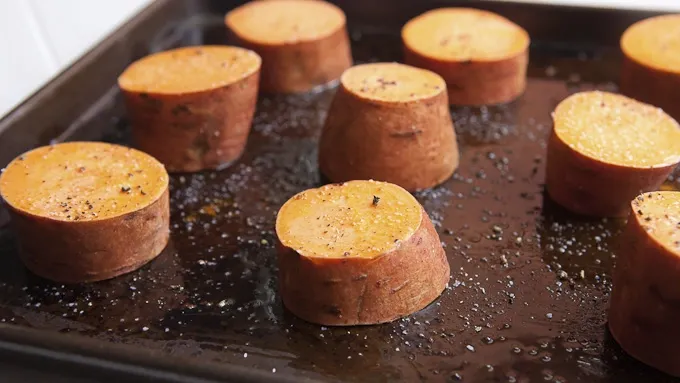 Step2Preheat oven to 350°F. Cut off the ends of the sweet potatoes, then cut them into quarters. Pour olive oil on a baking sheet and rub potatoes on both sides to coat. Sprinkle potatoes with salt and pepper.