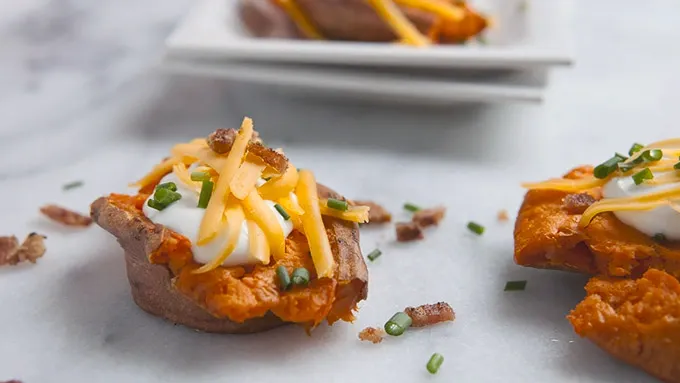 A great appetizer that combines the light sweetness of sweet potatoes and traditional loaded potato toppings!