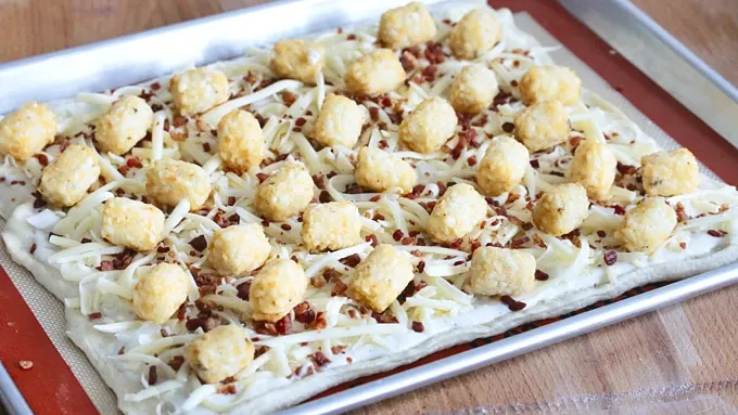 - This over-the-top pizza comes fully loaded and ready to be devoured. Really, I don't know what else to say. It's pizza. It's loaded. With Tater Tots™. And bacon. See, you're already running for the kitchen! And that's just what I did, too. And once I got to the kitchen it took all of 5 minutes to have this pizza loaded up and in the oven. And when this loaded pizza came out a few minutes later, it was bubbling and filling my kitchen with an aroma that I can only describe as "COMFORT." And then it was time to drizzle nacho cheese sauce over an already loaded comfort pizza. *GASP* By the way, the measurements are just a guideline. If you want your pizza even more "over"-loaded, feel free to add more!