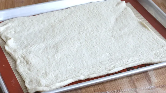 Step1Preheat the oven to 400°F. Unroll the pizza crust onto a non-stick or lined baking sheet and form into a rectangle or desired shape.