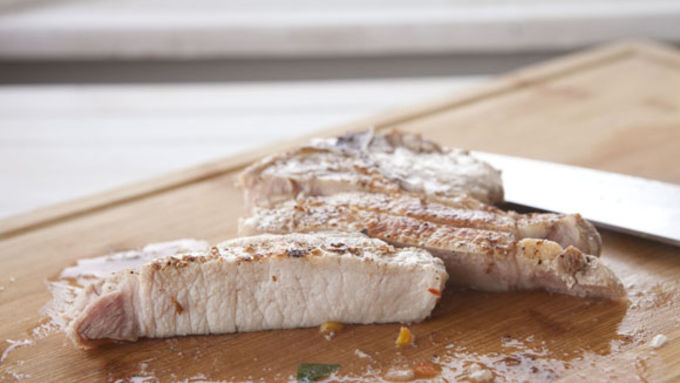 Step8Remove pan from oven and let cool for a few minutes. Then remove pork chops and slice into strips.