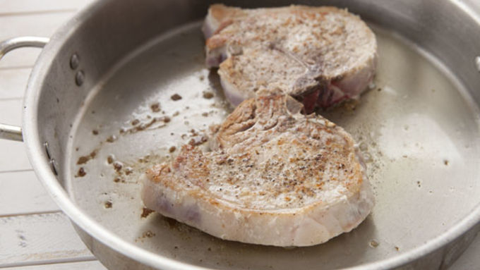 Step5In a large, heavy, oven-safe pan, heat olive oil over medium heat-high heat. Once hot, add pork chops and sear for 4 minutes per side. Also, preheat oven to 350°F.