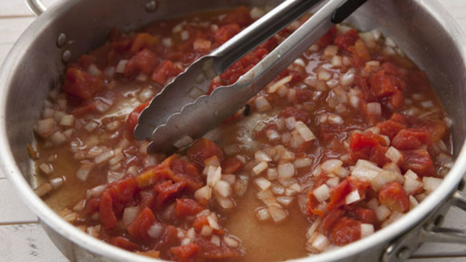 Step6Remove pork chops. Add diced onions to large pan and turn heat down to medium. Cook for a minute until onions soften. Add tomatoes and chicken stock to pan and season with a pinch of salt, pepper, and red pepper flakes.