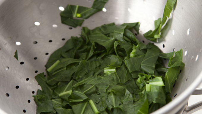 Step3Roughly chop collard greens and blanch in simmering water for 60 seconds. Drain and set aside for later.