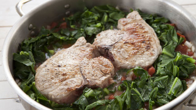 Step7Add collard greens to pan and add pork chops back in. Nestle chops down into the vegetable mixture. Add pan to oven, uncovered, and let braise for 15 minutes.