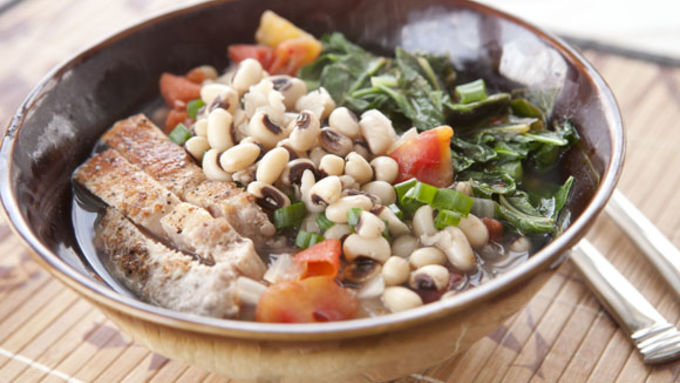 - Growing up, my family wasn’t much for traditions – and they definitely weren’t superstitious. All of that changed, though, on January first of every year when the world stopped so we could eat black-eyed peas. They are supposed to give you good luck for the entire year and I always figured that it was worth a shot. Even if the rumor isn’t true, at least you’ll get a good meal out of the deal! A lot of black-eyed pea recipes involve a big pot of soup or stew, but I like to split up the ingredients a bit. My Good Luck Bowls feature black-eyed peas (of course) along with braised pork chops and collard greens. It’s perfect for a cold New Year’s Day meal. Black-eyed peas are actually a legume, like beans, which means they are best cooked by soaking them overnight in cold water. Before you soak them, be sure to look through them and check for small pebbles. Sometimes there will be some dirt or pebble in with the peas – that’s just not a good way to start the New Year! And if you're short on time, most black-eyed peas will have a quick soak method on the package if you didn’t plan ahead. When you’re ready to serve, spoon in some black-eyed peas in each bowl. Add a few spoonfuls of the cooking liquid from the peas and then top the dish with some collard greens, a few strips of pork, and some chopped scallions. I’m not sure if I believe in good luck, but I’ll take any excuse to eat this meal!