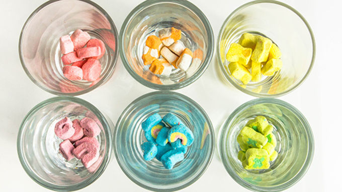 Step2Place 6 Lucky Charms™ marshmallows of the same color in each of 6 shot glasses. Pink marshmallows in one shot glass, yellow in another, and so on.