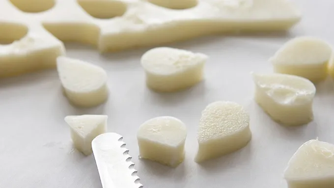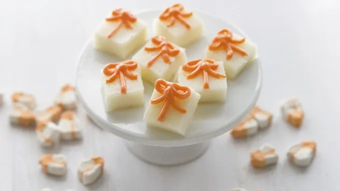 Cut each color into its coordinating shape. Use a sharp knife to cut one of the white batches into squares. Pipe an orange bow (like a gift) onto each square.