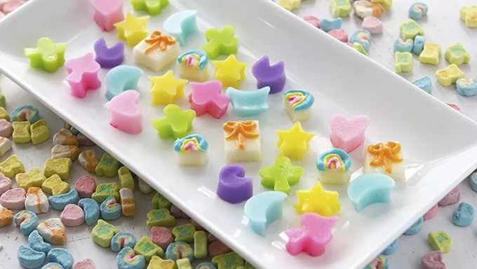 var configuration = {"title":"Lucky Charms™-Shaped Jello Shots","introduction":"Marshmallow vodka finds its way into these delightfully fun boozy jello shots. Shaped like Lucky Charms™ marshmallows, this may be the most colorful way ever to celebrate St. Patrick’s Day!","servingSize":"1 Serving","image":{"small":{"media":"(min-width: 0px)","src":"https://mojo.generalmills.com/api/public/content/vlPcJ5OBLkWLK8rJrcjgzw_webp_base.webp?v=dd9e8ad5\u0026t=e724eca7b3c24a8aaa6e089ed9e611fd"},"medium":{"media":"(min-width: 500px)","src":"https://rms-media-prod.generalmills.com/fa1b5f72-e27a-4f4e-a241-1d0b15e65f83.jpg"},"large":{"media":"(min-width: 767px)","src":"https://rms-media-prod.generalmills.com/fa1b5f72-e27a-4f4e-a241-1d0b15e65f83.jpg"},"alt":"Lucky Charms™-Shaped Jello Shots"},"contributor":{"label":"by:","name":"Cheeky Kitchen","profileUrl":"/contributors/cheeky-kitchen","displayDate":{"label":"Updated","date":"Oct 4, 2017"}},"ingredientGroups":[{"ingredients":[{"quantity":"8","description":"envelopes (1/4 oz. each) unflavored gelatin powder"},{"quantity":"1 1/2","description":"cups cold water"},{"quantity":"1 1/2","description":"cups boiling water"},{"quantity":"1","description":"cup sugar"},{"quantity":"3","description":"cups marshmallow vodka"},{"quantity":"2","description":"cup heavy cream"},{"quantity":"","description":"Betty Crocker™ Food Color Gel: pink, purple, green, blue, yellow, orange"},{"quantity":"2","description":"tablespoons from 1 tub (16 oz) Betty Crocker™ Rich \u0026 Creamy Vanilla Frosting, tinted orange"},{"quantity":"2","description":"tablespoons from 1 tub (16 oz) Betty Crocker™ Rich \u0026 Creamy Vanilla Frosting, tinted blue "},{"quantity":"2","description":"tablespoons from 1 tub (16 oz) Betty Crocker™ Rich \u0026 Creamy Vanilla Frosting, tinted pink"},{"quantity":"2","description":"tablespoons from 1 tub (16 oz) Betty Crocker™ Rich \u0026 Creamy Vanilla Frosting, tinted yellow"},{"quantity":"","description":"Nonstick baking spray"}]}],"steps":[{"description":"Spray 8 mini loaf tins with nonstick oil spray. Gently wipe the spray so it leaves only a thin layer, but does not pool around the edges of the loaf tins."},{"description":"In a large bowl, sprinkle gelatin over cold water and allow to sit for 1-2 minutes. Add boiling water and sugar, whisk quickly until it completely dissolved, about 3 minutes. Add vodka and whisk another 1-2 minutes. Then whisk in cream."},{"description":"Transfer 1 cup of the mixture to each of 6 small bowls. Tint each bowl with the following:\r\nLight pink (will be cut into hearts)\r\nDark pink (will be cut into spades)\r\nLight blue (will be cut into moons)\r\nLight purple (will be cut into horseshoes using a teardrop-shaped cutter)\r\nLight green (will be cut into shamrocks)\r\nDark yellow (will be cut into stars)"},{"description":"Leave the other 2 cups of the mixture un-tinted white. Pour 1 cup of prepared gelatin into each of the 8 prepared loaf tins. You should have 2 white colored tins, and 1 tin of light pink, dark pink, light blue, light purple, light green and dark yellow. Refrigerate until set up, about 60 minutes."},{"description":"Cut each color into its coordinating shape. Use a sharp knife to cut one of the white batches into squares. Pipe an orange bow (like a gift) onto each square.","stepShotImageUrl":"//mojo.generalmills.com/api/public/content/zTztJ2uNzkuAWyLuQBmQzQ_webp_base.webp?v=d35f5e53\u0026t=3653fe2f5ecd4a47a5a51c97e429947c"},{"description":"Cut the second white batch with the teardrop-shaped cutter. Slice the tip off of each piece with a sharp knife, leaving half-circle shaped pieces. Pipe pink, blue, and yellow frosting onto each half-circle, creating little frosting rainbows.","stepShotImageUrl":"//mojo.generalmills.com/api/public/content/efTu55K3TEWL0R_v0wE4hg_webp_base.webp?v=674c26e1\u0026t=3653fe2f5ecd4a47a5a51c97e429947c"},{"description":"Refrigerate until ready to serve. Enjoy!","stepShotImageUrl":"//mojo.generalmills.com/api/public/content/fmSAMR6vlEu9Dxx_ME5bag_webp_base.webp?v=d7eb87f2\u0026t=3653fe2f5ecd4a47a5a51c97e429947c"}],"tips":[{"title":"","description":"Special equipment required: 8 mini loaf tins and mini cookie cutters in the shapes of a star, teardrop, spade, heart, moon and shamrock (sold in a set online).","category":"Techniques","tipShots":[]},{"title":"","description":"If you\u0027re gonna have a party, do it colorfully. And deliciously!\r\n\r\nFeel like a true grown-up with boozy jelly shots shaped just like... Lucky Charms™ marshmallows!\r\n\r\nYour mom spent half your childhood telling you to not pick the marshmallows out of the cereal.\r\n\r\nBut the day of reckoning has come, dear friends. You’ve grown that lumberjack beard. You make your own bed (occasionally). You’ve practically moved out of her basement.\r\n\r\nAnd now it’s time to eat your cereal any ol’ durned way you want—marshmallows only, vodka spiked.\r\n\r\nThis recipe is adulthood, waving its bright and cheery welcome right in your mouth. Or something like that. Whatever it is, it’s brilliant. You need it. \r\n\r\nStart first with a teeny-tiny set of cookie cutters. I found these at Williams Sonoma.\r\n\r\nYou\u0027ll need those cute little cereal marshmallows to surround your boozy versions. And then you need to find some party peeps, because you really shouldn\u0027t eat these alone...\r\n\r\nKnow who you should share these with? Your mom.\r\n\r\nShe’ll be so delighted to see you’re not picking the marshmallows out of the box, after all. ","category":"Editorial","tipShots":[]}],"kitchenTips":[{"title":"","description":"Special equipment required: 8 mini loaf tins and mini cookie cutters in the shapes of a star, teardrop, spade, heart, moon and shamrock (sold in a set online).","category":"Techniques","tipShots":[]}],"additionalContent":[],"faq":[],"tipCategories":[{"categoryName":"Editorial","heading":"More About This Recipe","cssClass":"recipePartStory","expandOnInit":false,"ex