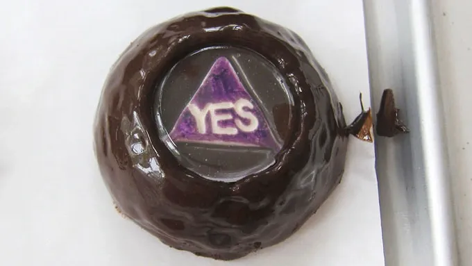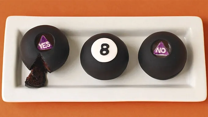 - These realistic-looking cakes are the answer to your dessert cravings. How many times have you closed your eyes, asked a question, shook a Magic 8 Ball, and hoped for a good response? I have more times than I wish to admit. It's a fun yet silly way to get an answer to life's important questions when you're young, like "Does Billy like me," or "Will I pass my test?" It's an iconic toy that has entertained generations of kids and I thought it would be a challenge to make some Magic 8 Ball Cakes that look as realistic as possible. Did I get it right? I'll ask the 8 ball. "YES." Good answer! Since Magic 8 Balls are black, I decided my cake should be chocolate inside and I whipped up a batch of Betty Crocker chocolate fudge cake mix. To create a round cake I needed half-sphere pans and chose to use silicone molds that had 6 half-sphere cavities in each. I wanted my 8 balls to have the iconic plastic window in which you would see the answer to your questions. In order to create a clear edible window I used Isomalt instead of boiled sugar. If you’ve never worked with or even heard of Isomalt, it’s a sugar substitute that can be melted and remains clear once poured. I purchased Isomalt Nibs, which can simply be melted down and poured. I suggest when working with Isomalt that you use extreme caution! Once the Isomalt comes to a boil it is extremely hot and sticky. If it gets on your skin it will cause serious burns. If you aren't going to serve these the day you cover them in fondant, keep the two halves apart and stored with the flat side down, then attach them before serving. This will help maintain their round shape and keep the decoration from sticking to a serving platter. While these cakes may not give you the answers to all of your questions, they will definitely satisfy your dessert cravings!
