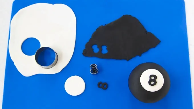 Step9Roll out a small amount of black fondant and cut 9 number 8 shapes using a small cutter. Attach the number 8’s to the centers of the white fondant circles using a small amount of water. Set aside.