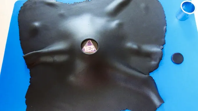Step14Roll out black fondant to an 8-inch circle. Cut a 3/4-inch circle out of the center. Set one cake on your work surface, draping a piece of fondant on top. Smooth out the fondant, allowing the center hole to stretch to match the circumference of the candy disc. Then cut the fondant around the base of the cake. Repeat covering all nine cakes.