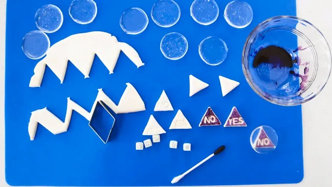 Step6Roll the white fondant out on a silicone mat. Cut triangles that will fit inside the dimensions of your round candy discs. Using small letter stamps, imprint the triangles with the words “yes” or “no.” Brush purple food coloring over the triangles and allow to dry.