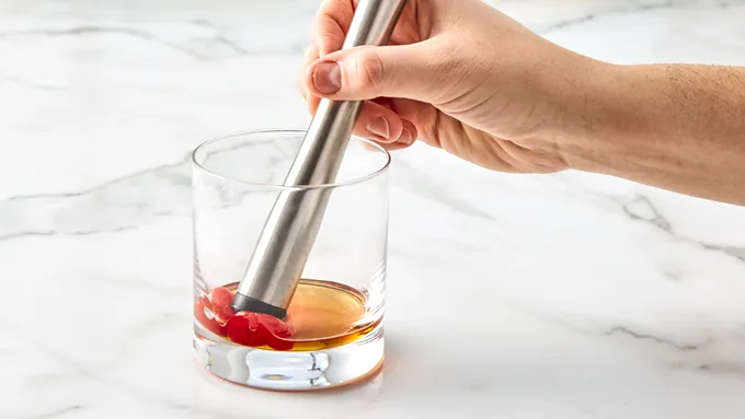 Step1Gently muddle cherries with bitters and maple syrup in a cocktail glass.